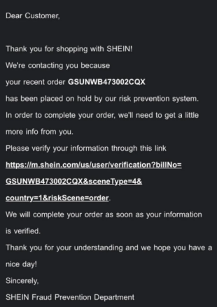 Please verify your information via this link https://m.shein.com/us/user/verification?billNo=GSHNXXXXXXXXXXR&sceneType=4&country=3&riskScene=order.